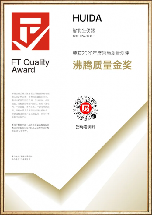 沸腾质量金奖不是终点,而是惠达践行品质承诺的新起点。未来,惠达卫浴将继续以用户健康为核心,以创新为引擎,在全球化的舞台上不断打磨技术、优化体验。相信这款满载认可的惠达深盾S6Pro,终将成为更多家庭的健康之选,而惠达卫浴也将持续引领中国卫浴产业,迈向更高质量的发展新阶段。
